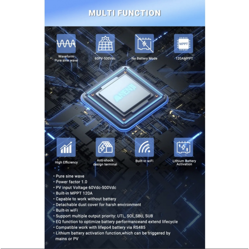 Пристрій працює з акумуляторними батареями напругою 48 V та забезпечує чисту синусоїду на виході, що гарантує безпечне живлення побутової та офісної техніки, включно з чутливими електроприладами. Гібридна архітектура дозволяє працювати від мережі, акумуляторів і сонячних панелей з автоматичним перемиканням режимів.
