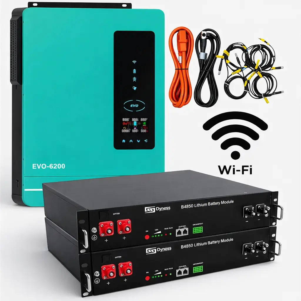 Готове рішення для автономного та резервного електроживлення під час відключень світла. Комплект поєднує гібридний інвертор Anern AN-SCI-EVO-6200 та два акумуляторні блоки Dyness B4850 (LiFePO₄), забезпечуючи стабільну, безпечну та масштабовану систему живлення для дому, офісу або сонячної електростанції.
